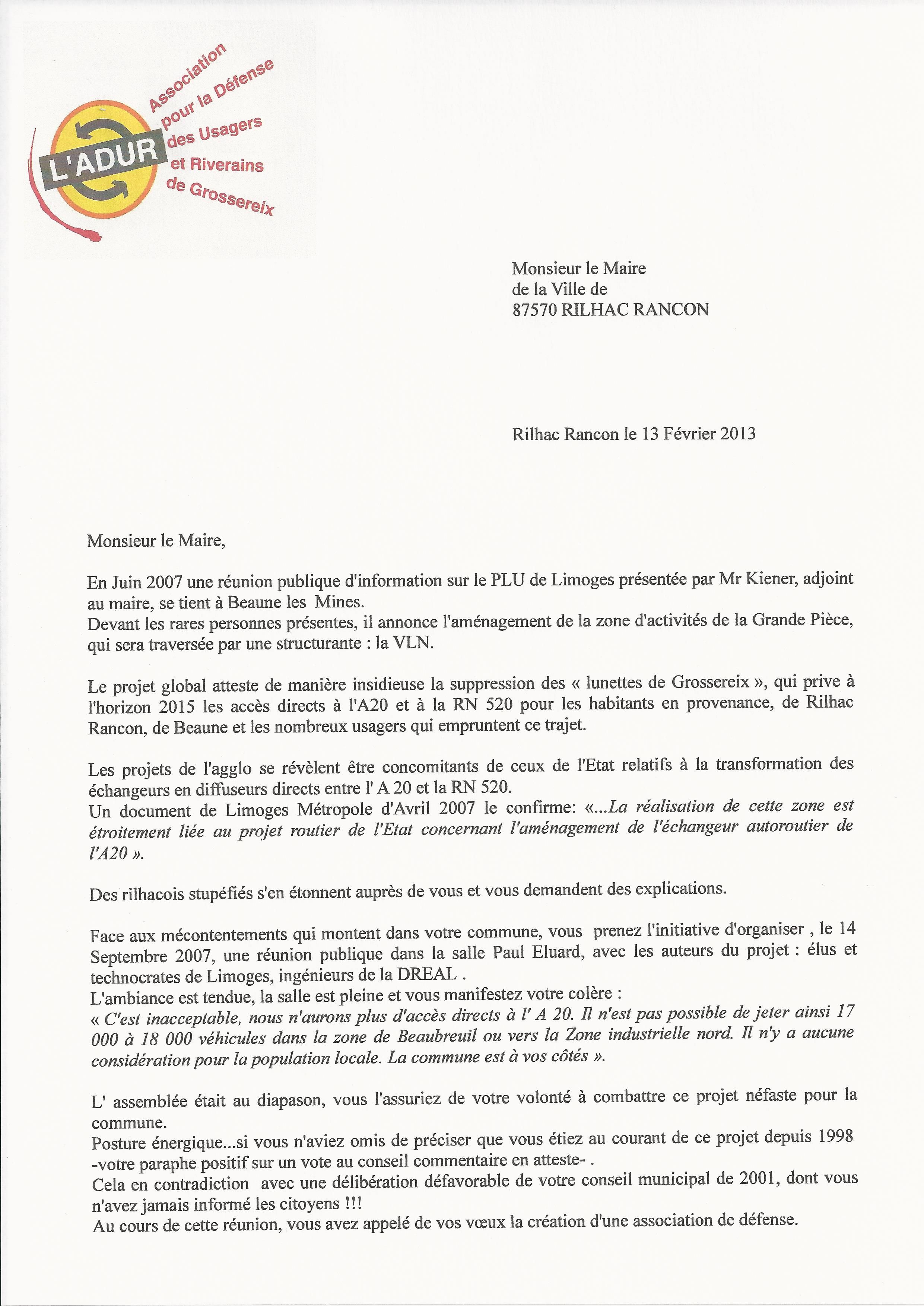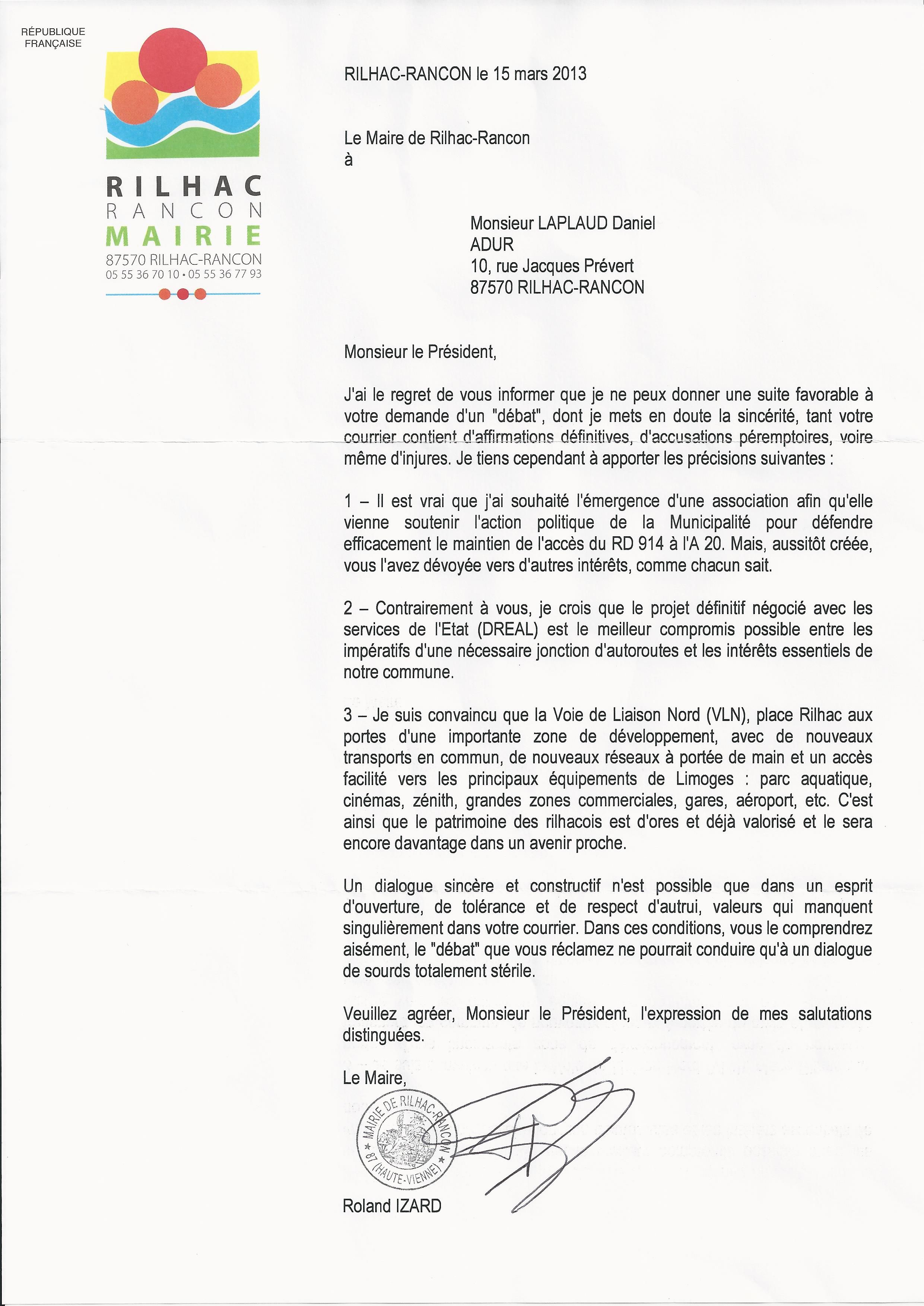 Vous trouverez ci-dessous, copie du courrier que nous avions envoyé au maire de Rilhac Rancon pour lui demander une rencontre, ainsi qu sa réponse qui nous est parvenue plus d'un mois aprés!